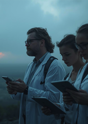 Create a picture where a male geek, female analyst, and scientist scout a distant horizon for information about technological developments that are hard to imagine in the present. They record their observations on an ipad or a notebook. The scientist is measuring something in the distance.
